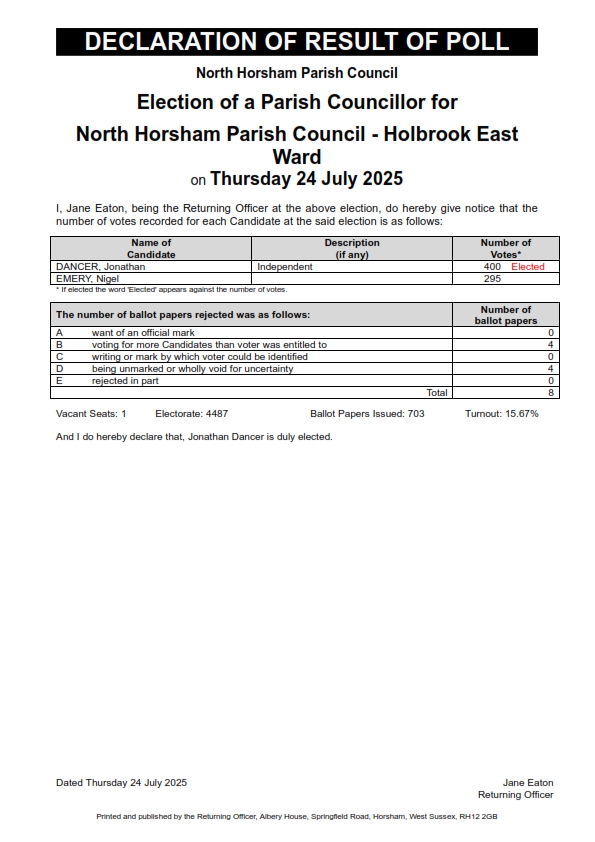 North Horsham Parish Council mourns the loss of its longest serving Member, Peter Burgess, who passed away recently.