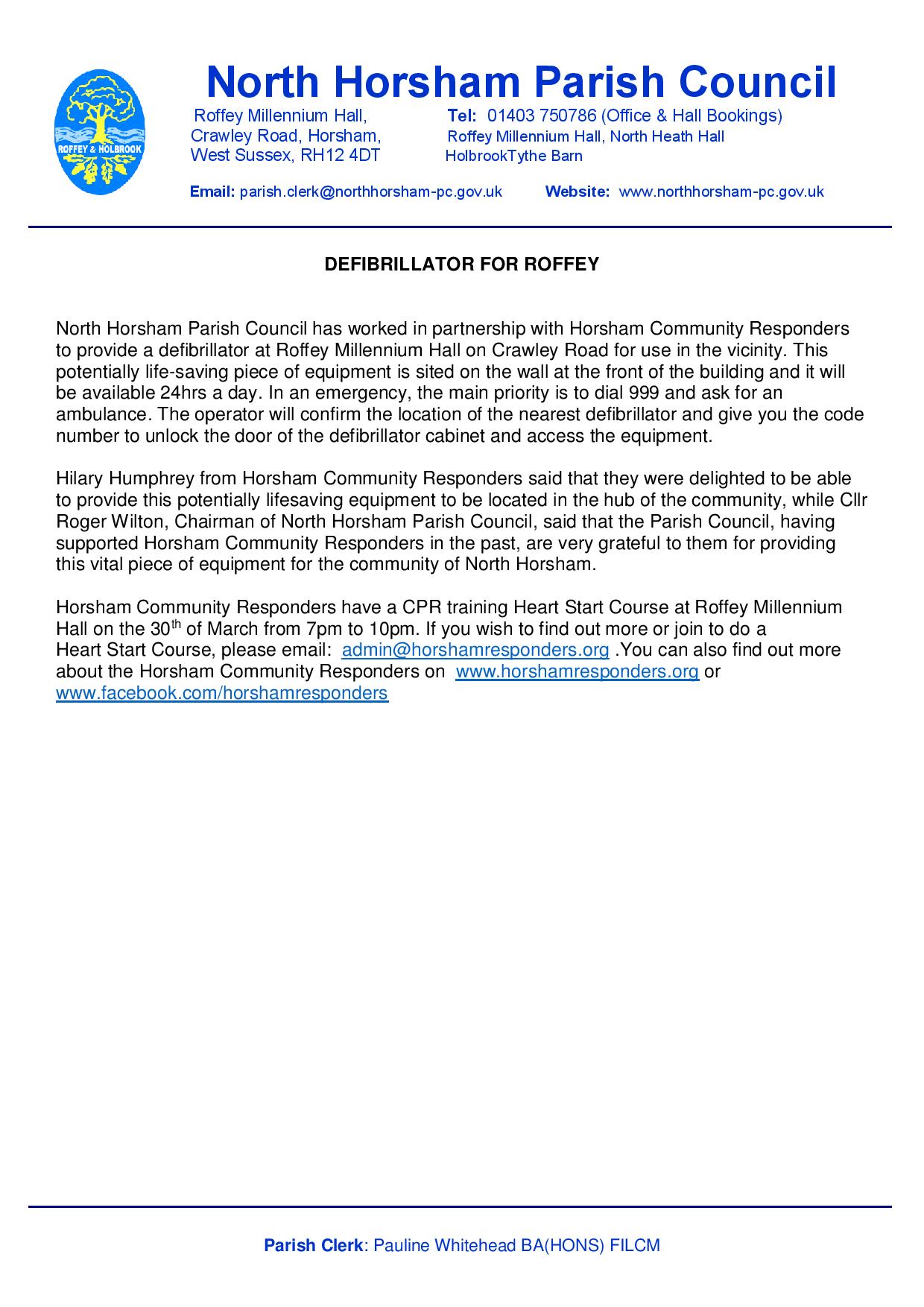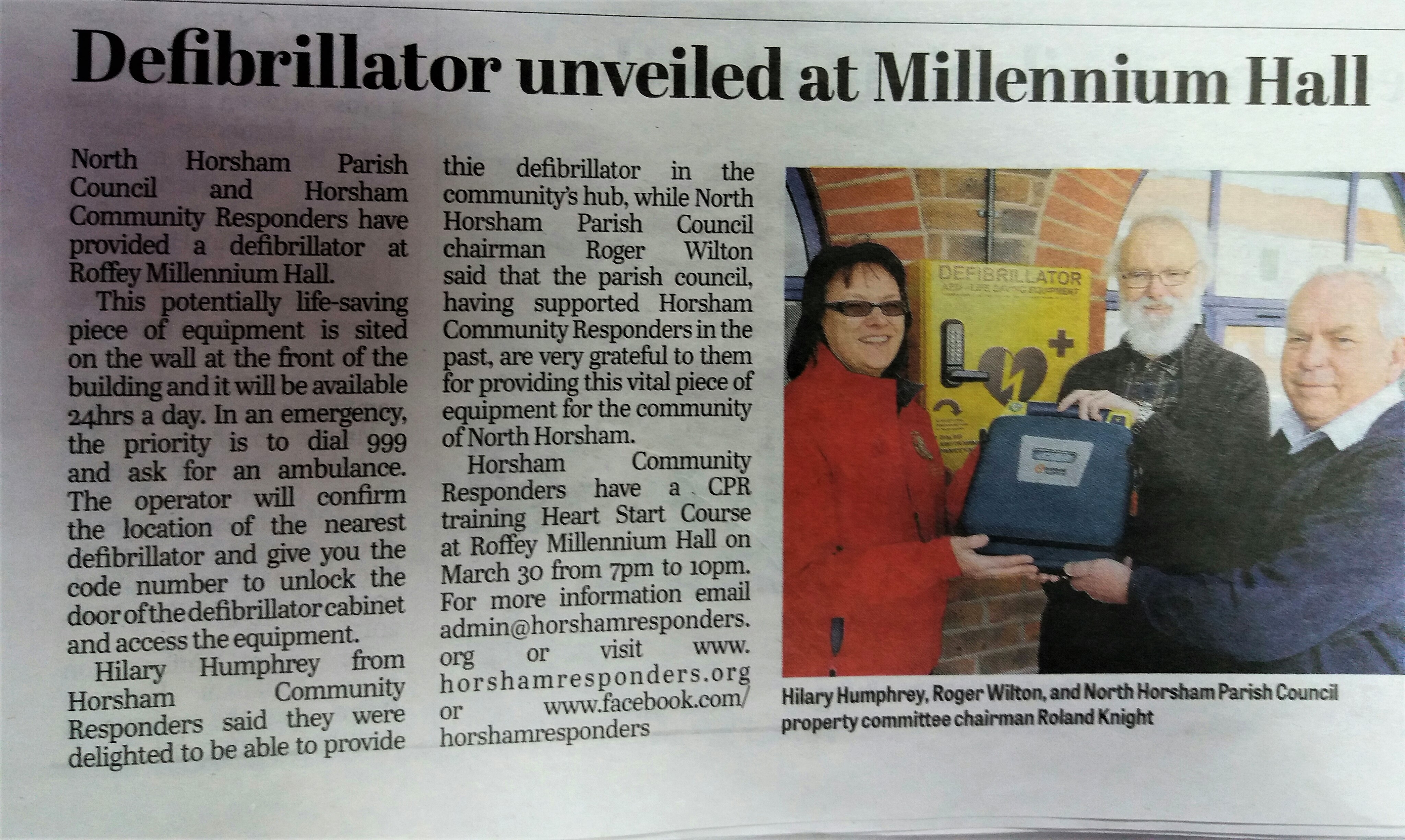 Defibrillator Unveiled at Roffey Millennium Hall 15 March , 2017 / northhorshamparishcouncil Share this: Click to share on X (Opens in new window) X Click to share on Facebook (Opens in new window) Facebook Like Loading...
