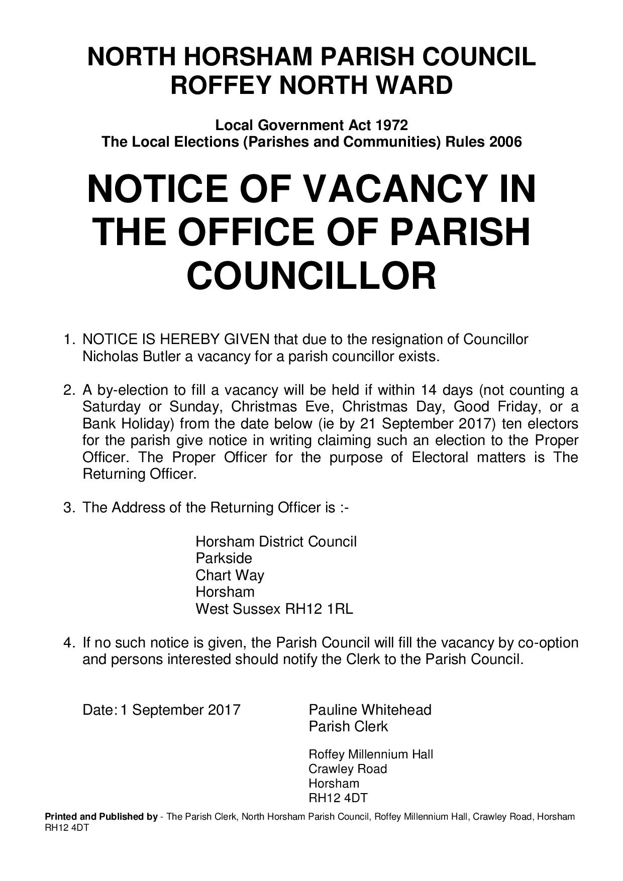 Parish Councillor Vacancy – Roffey North Ward 1 September , 20177 September , 2017 / northhorshamparishcouncil For application forms and more information please visit the Parish Councillor Vacancy page Share this: Click to share on X (Opens in new window) X Click to share on Facebook (Opens in new window) Facebook Like Loading...