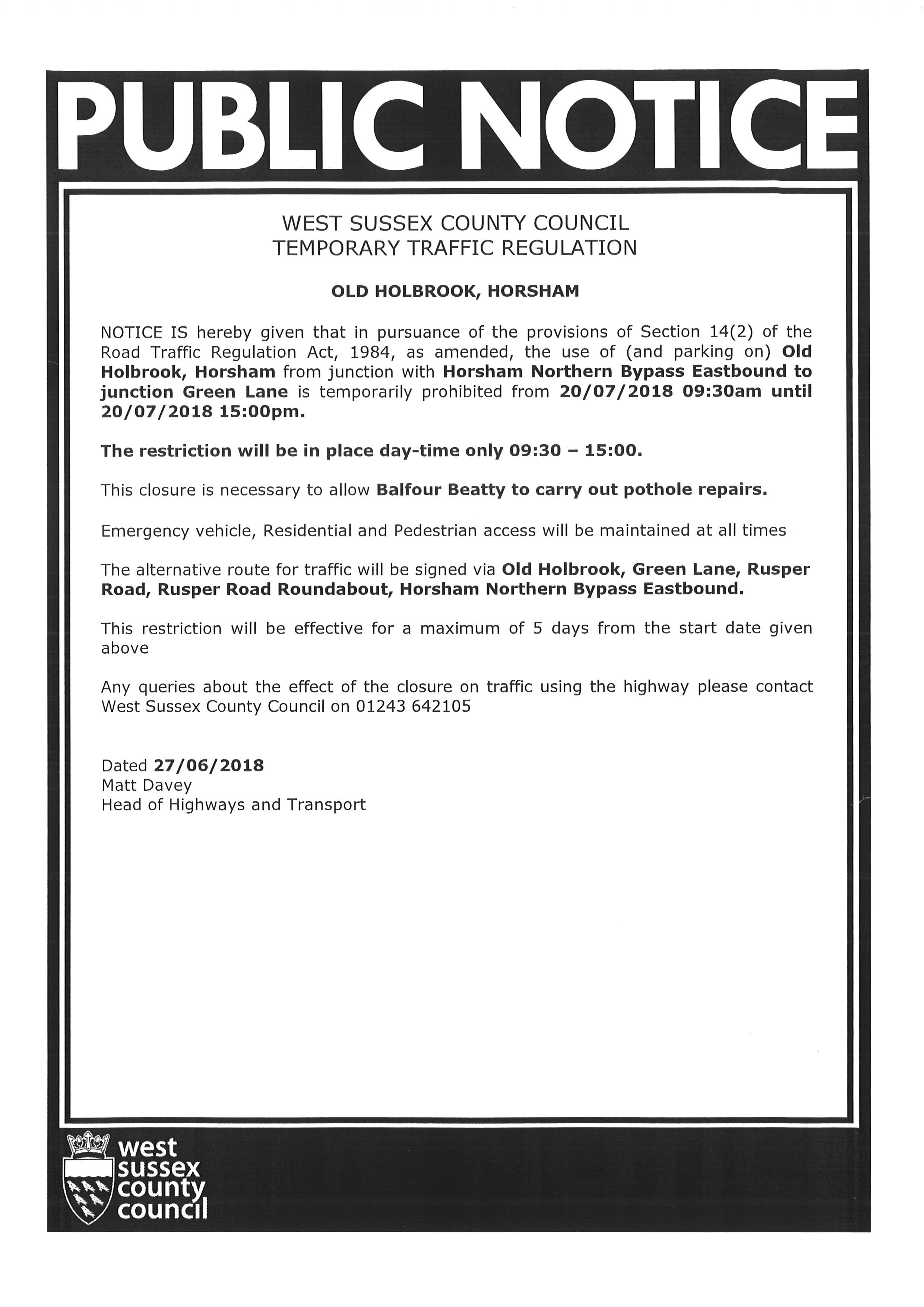 Share this: Click to share on X (Opens in new window) X Click to share on Facebook (Opens in new window) Facebook Like Loading... Old Holbrook Temporary Traffic Regulation 3 July , 2018 / northhorshamparishcouncil / Leave a comment