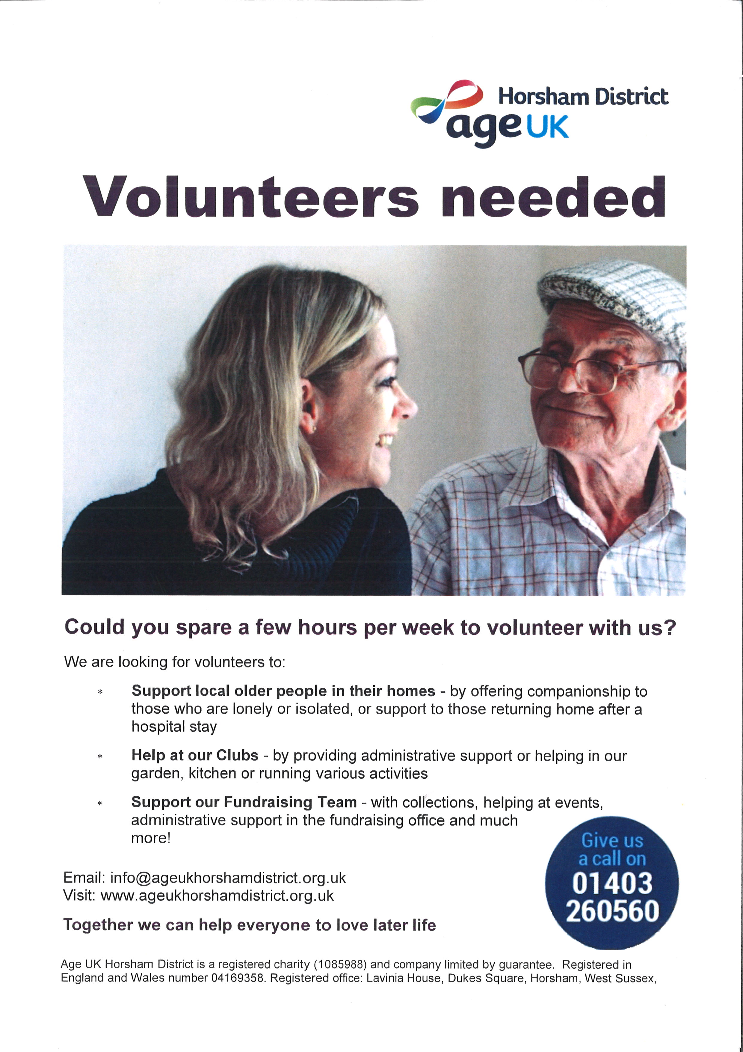 Share this: Share on X (Opens in new window) X Share on Facebook (Opens in new window) Facebook Like Loading... Volunteers needed by Age UK Horsham District 30 July , 2018 / northhorshamparishcouncil / Leave a comment