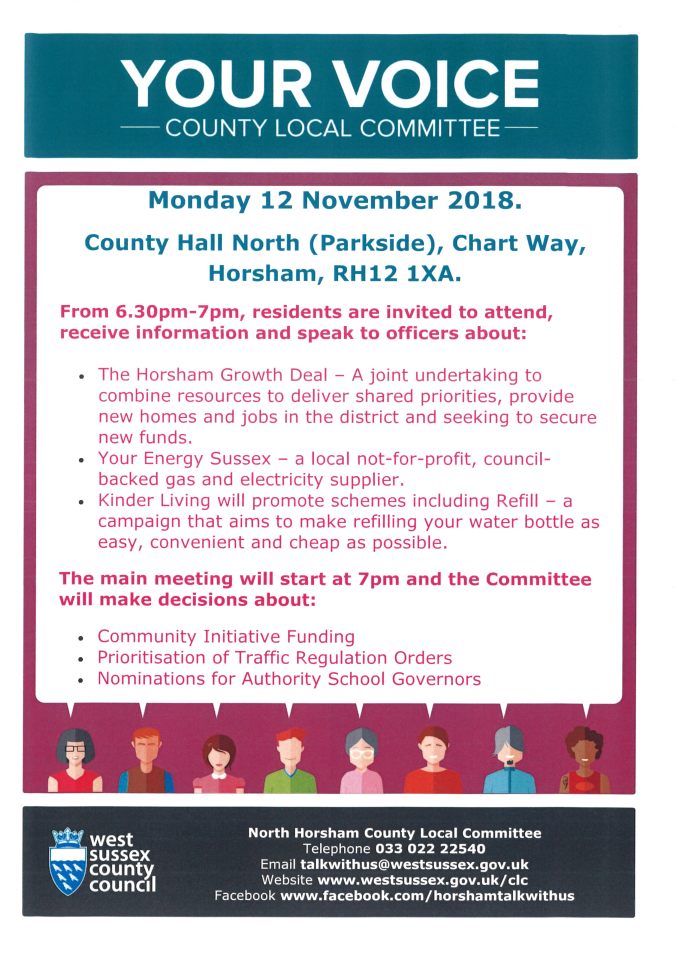 WSCC County Local Committee in North Horsham 5 November , 2018 / northhorshamparishcouncil All are welcome. Share this: Click to share on X (Opens in new window) X Click to share on Facebook (Opens in new window) Facebook Like Loading...