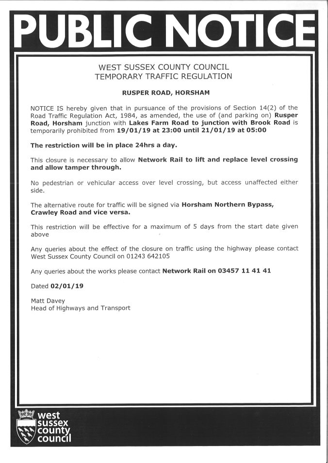 The notice should read Lambs Farm Road to Brook Road NOT Lakes Farm Road as in the notice. Share this: Click to share on X (Opens in new window) X Click to share on Facebook (Opens in new window) Facebook Like Loading... Road closure – Rusper Road 3 January , 20194 January , 2019 / northhorshamparishcouncil / Leave a comment
