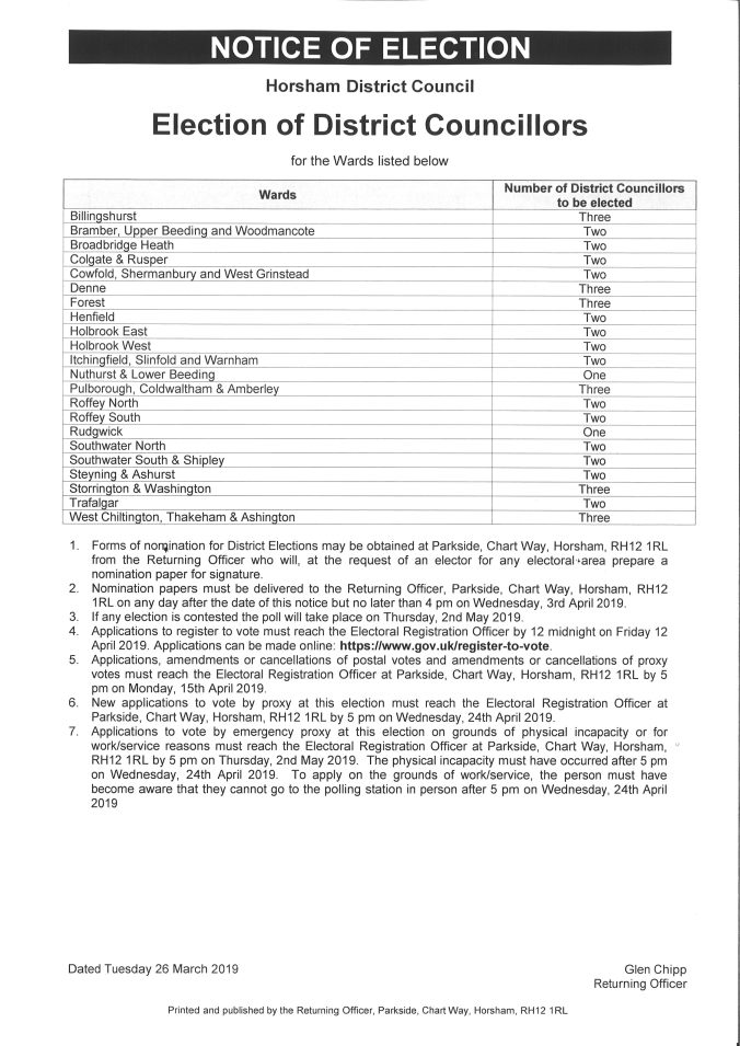 Share this: Click to share on X (Opens in new window) X Click to share on Facebook (Opens in new window) Facebook Like Loading... Horsham District Council elections 2nd May 2019 28 March , 2019 / northhorshamparishcouncil / Leave a comment