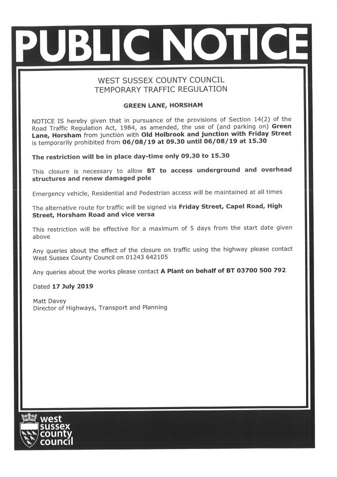 Share this: Click to share on X (Opens in new window) X Click to share on Facebook (Opens in new window) Facebook Like Loading... Temporary Road closure – Green Lane Horsham 17 July , 2019 / northhorshamparishcouncil / Leave a comment