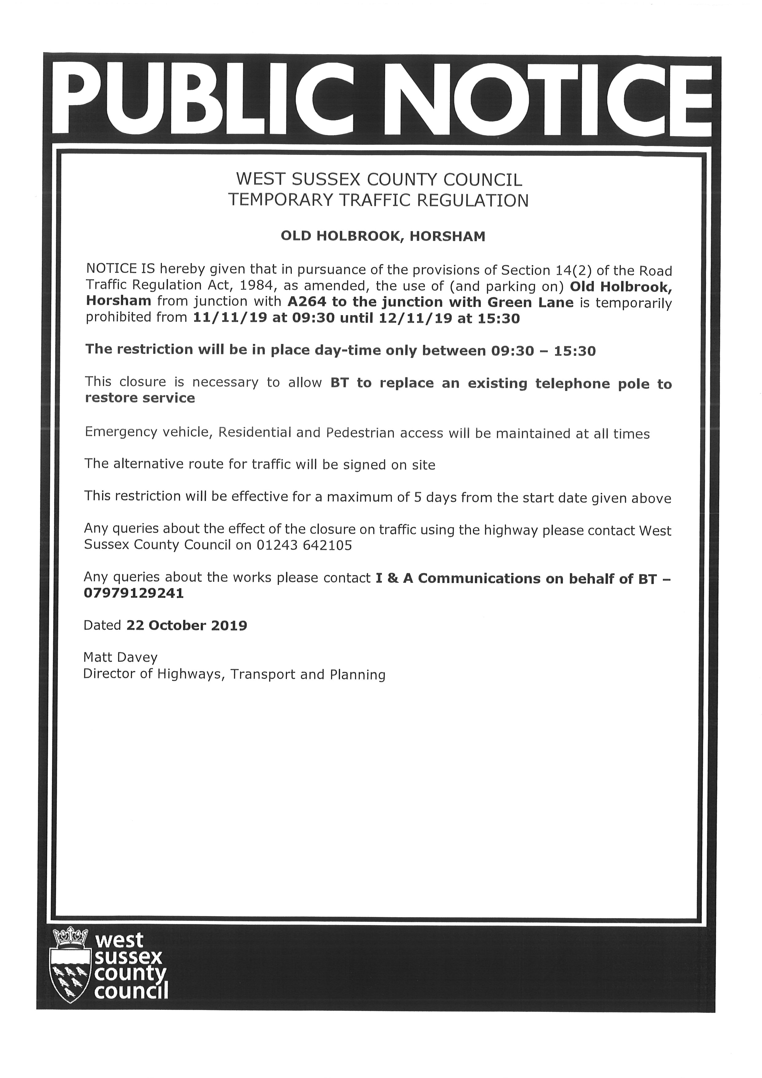 Share this: Click to share on X (Opens in new window) X Click to share on Facebook (Opens in new window) Facebook Like Loading... Old Holbrook Road Closure 11th – 12th November 2019 23 October , 2019 / northhorshamparishcouncil / Leave a comment