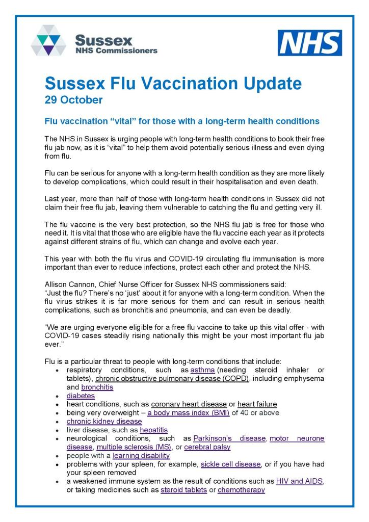 Sussex Flu Vaccination Update 3 November , 20203 November , 2020 / northhorshamparishcouncil Sussex Flu Vaccination Update 29 October – Flu vaccination vital for those with a long-term health conditionsDownload Share this: Click to share on X (Opens in new window) X Click to share on Facebook (Opens in new window) Facebook Like Loading...