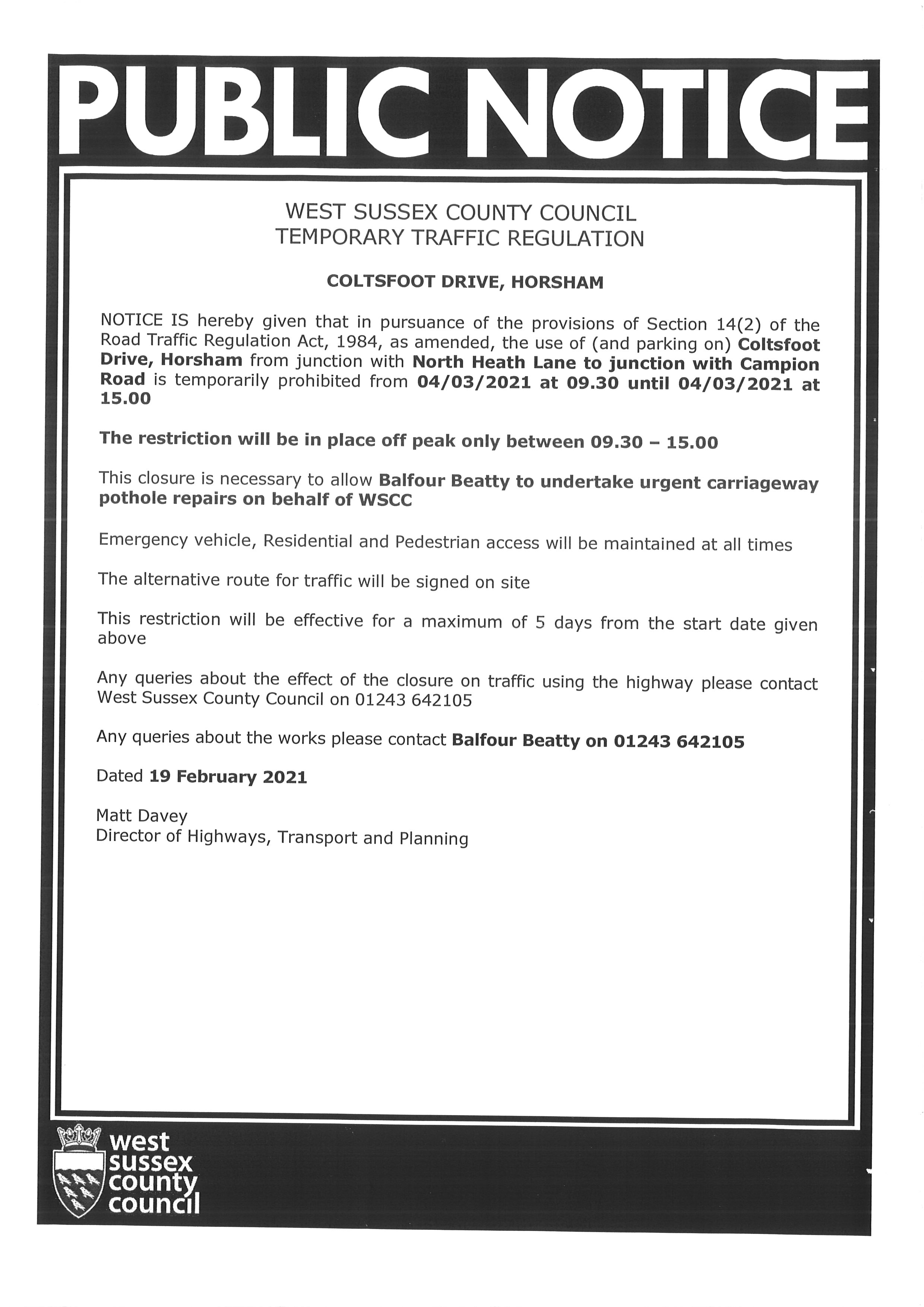 Share this: Click to share on X (Opens in new window) X Click to share on Facebook (Opens in new window) Facebook Like Loading... Temporary Traffic Regulation – Coltsfoot Drive 21 February , 2021 / northhorshamparishcouncil / Leave a comment
