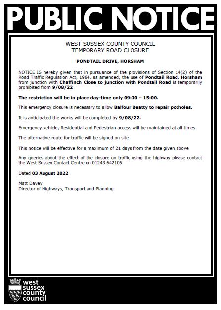 Temporary Road Closure 09/08/2022 – Pondtail Drive 3 August , 20223 August , 2022 / northhorshamparishcouncil Share this: Click to share on X (Opens in new window) X Click to share on Facebook (Opens in new window) Facebook Like Loading...
