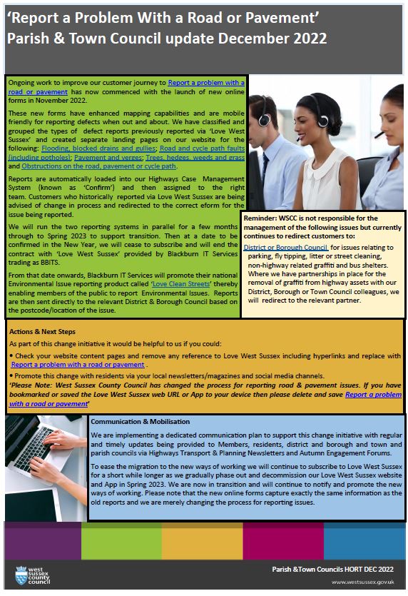 Please see the information below to report a problem with a road or pavement – the link to report is Report a problem with a road or pavement