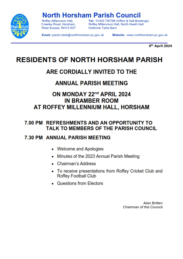 Come along to the meeting on 22nd April, have a chat with the local Councillors over a tea or coffee and hear from two of the Parishes largest sporting organisations – Roffey Cricket Club and Roffey Football Club – about the activities at the clubs and their plans for the future.