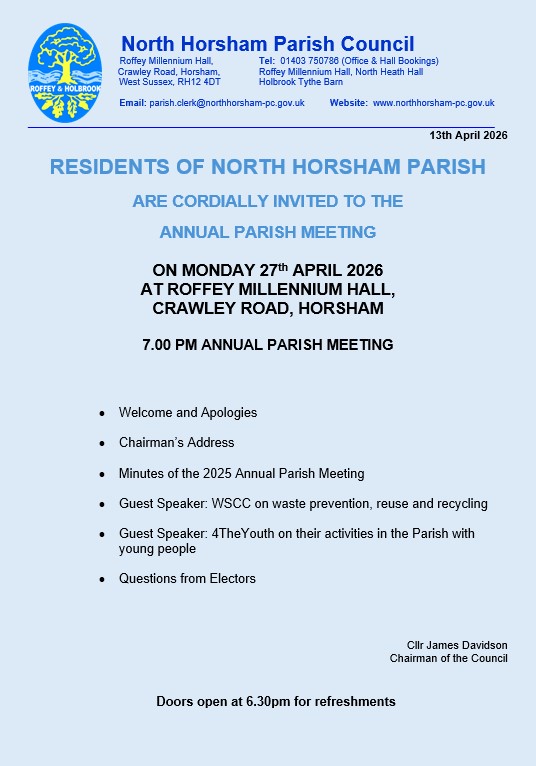 Share this: Share on X (Opens in new window) X Share on Facebook (Opens in new window) Facebook Like Loading... Annual Parish Meeting – Monday 27th April 2026 13 April , 202613 April , 2026 / northhorshamparishcouncil